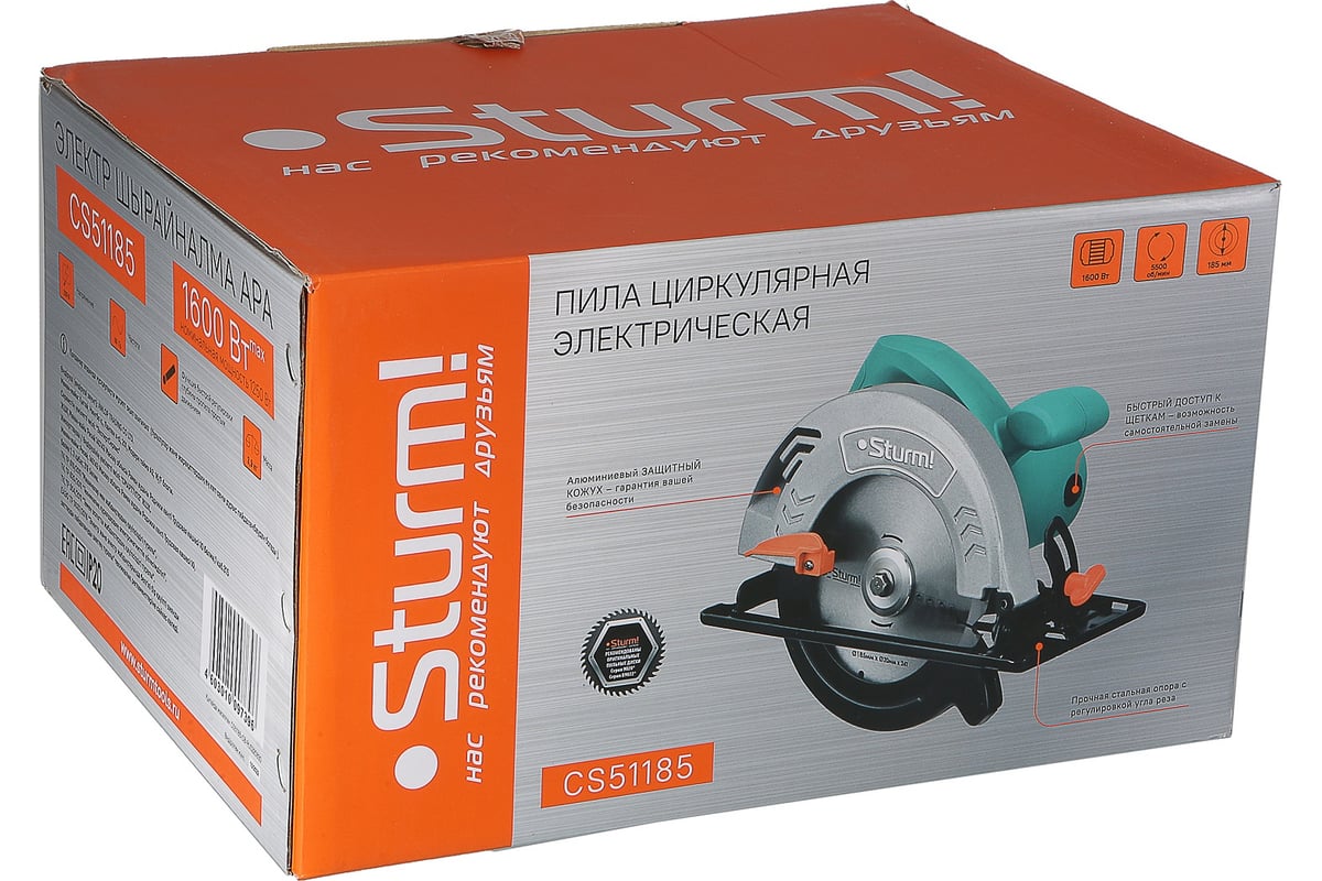 Sturm CS51185 – циркулярная пила бытового назначения под рабочий диаметр пильного диска 185 мм. Модель оснащена мощным 1600 Вт двигателем, развивающим скорость вращения 5500 об/мин и уверенно справляется с пропилами глубиной до 59 мм. В зависимости от конкретной задачи, за счет регулируемой опорной платформы, глубину пропила можно устанавливать на необходимую пользователю величину. Кроме того, опорная платформа имеет возможность регулировки и безынструментальной фиксации с помощью удобных зажимных барашковых гаек в наклонном положении на угол до 45 градусов. Для максимально точной установки опорной платформы под требуемым углом предусмотрена специальная шкала с насечкой. Инструмент обладает оптимальными массово-габаритными показателями, нейтральный центром тяжести и отличной эргономикой благодаря чему легко контролируется и способствует работе без усталости продолжительной время.