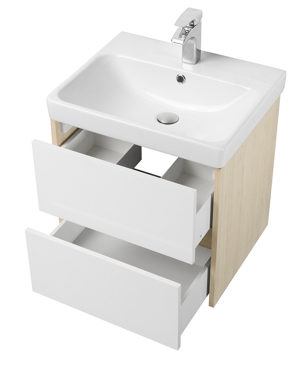 - Функционал тумбы включает два выдвижных ящика, установленных на направляющие push to open