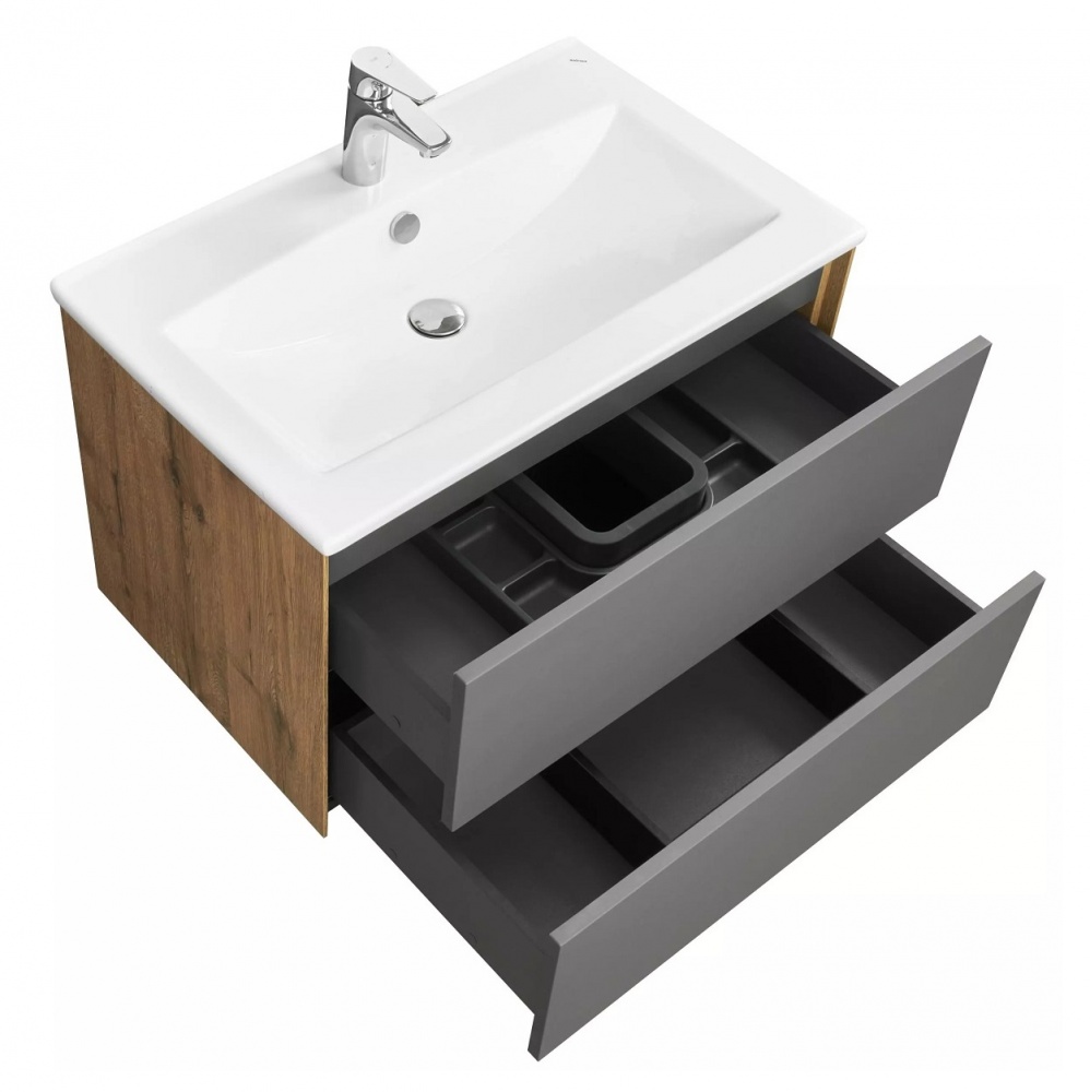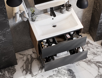 Тумба Сохо 75 функционально состоит из двух вместительных ящиков, оснащенных системой push to open, обеспечивающей надежное, комфортное и бесшумное закрывание. Фасады изделия – МДФ в пленке, корпус – ламинированная влагостойкая ДСП . Верхний и нижний ящики оснащены системой организации пространства, которая позволяет содержать косметические средства в идеальном порядке. Дополняет тумбу стильная раковина Элина от бренда Santek с удобной чашей. Все внутренние детали тумбы выполнены в цвете антрацит.