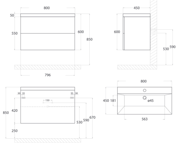- Комплект подвесной мебели для ванной комнаты с керамической раковиной