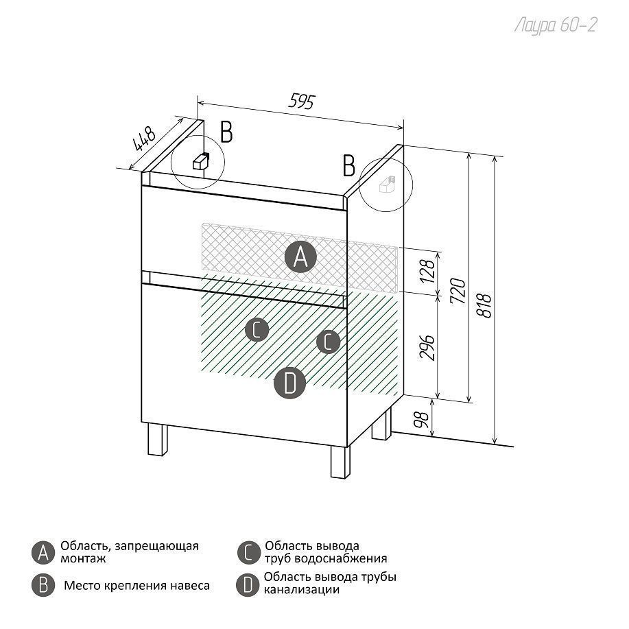 - Тумба установлена на хромированные ножки высотой 10 см, а для надежного крепления предусмотрены подвесы в комплекте.