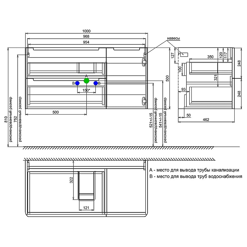 - Организация внутреннего пространства (описание): 2 внешних ящика,1 распашная дверца с вкладной полкой. В верхнем ящике расположен ограничитель под сифон, в нижнем ящике вкладной организатор