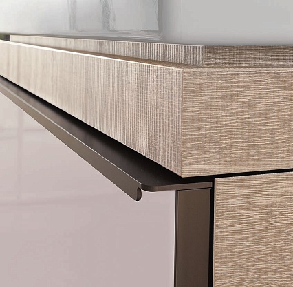 Необычные тумбы под раковины со стеклянными панелями в цвете металлической планки. Опционально тумбы под раковину могут комплектоваться ножками. Верхняя стеклянная панель под встраиваемые раковины соответствует по цвету тумбам под раковину.