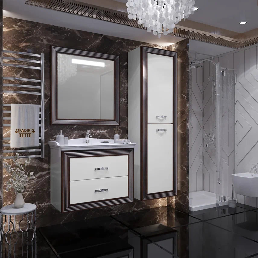 Фасады изготавливаются из высококачественного МДФ с глянцевым покрытием — бежевый оттенок для обрамления с золотой патиной, белый оттенок для обрамления с серебристой патиной. Обрамления для ящиков и зеркала выполнены из натурального массива бука в сочетании с золотой и серебряной патиной.
