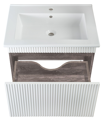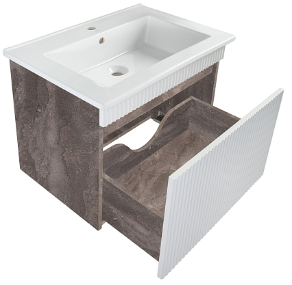 Тумба с раковиной – это изысканность и утончённая роскошь в интерьере. Волнистые рифленые фасады визуально «оживляют» и «приводят в движение» всю обстановку комнаты, сохраняя при этом умиротворение и покой, превосходно сочетаются с древесной фактурой и текстурой необработанного натурального камня корпуса.