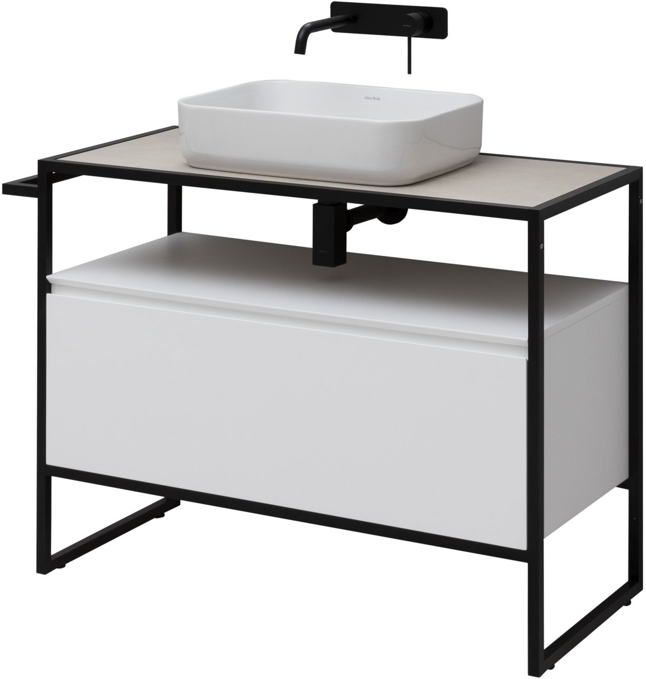 - Стильный каркас тумбы выполнен из металла, имеет брашированную поверхность с нанесением цвета путем анодирования
