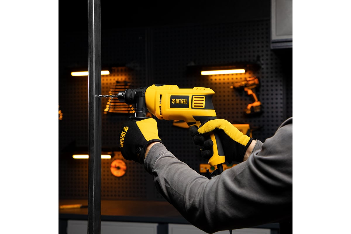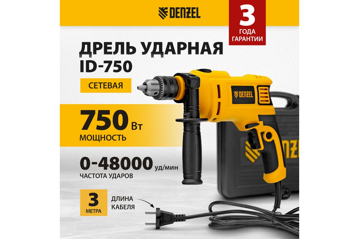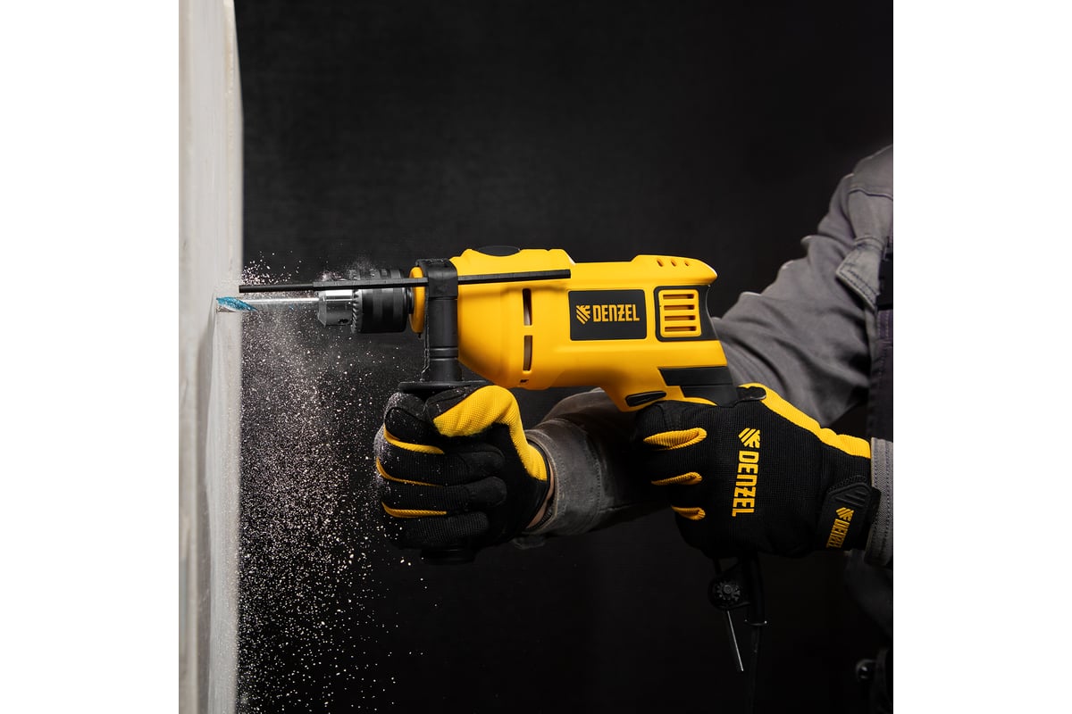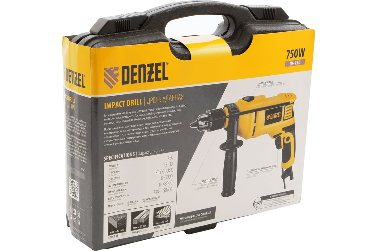 Ударная дрель DENZEL ID-750 26307 универсальна в эксплуатации. Предназначена для сверления в древесине, металле, кирпичной кладке и легком бетоне.