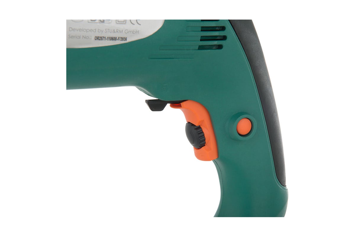 .Дрель обладает двигателем мощностью 11500 Вт. Данный инструмент предназначенный для сверления и ударного сверления в различных материалах. Скорость работы с такими материалами достигает 3000 оборотов в минуту. Наделена такими важными функциями, как реверс, регулировка скорости, блокировка включения.