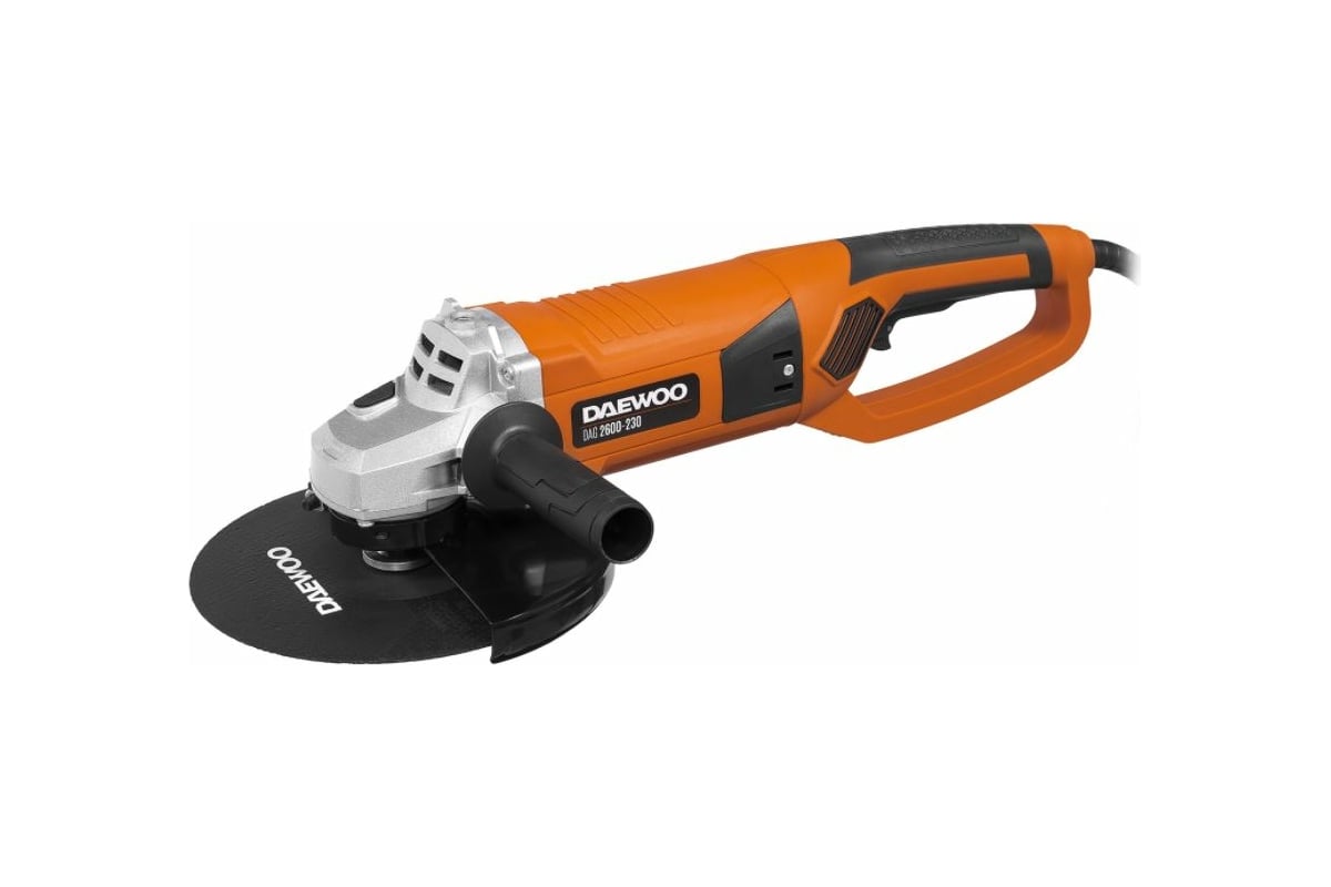 Углошлифовальная машина DAEWOO DAG 2600-230 используется для шлифования, резания и зачистки изделий из металла и прочих материалов. Рабочую оснастку можно быстро и безопасно заменить благодаря наличию функции блокировки шпинделя. Для сохранности материала заготовки и уменьшения нагрузки на сеть при запуске временно снижаются крутящий момент и нагрузка электродвигателя. Диск закрыт металлическим кожухом, благодаря чему оператор защищен от случайного контакта с режущим элементом, а так же исключается вылет мелкой стружки и искр в глаза и на одежду.