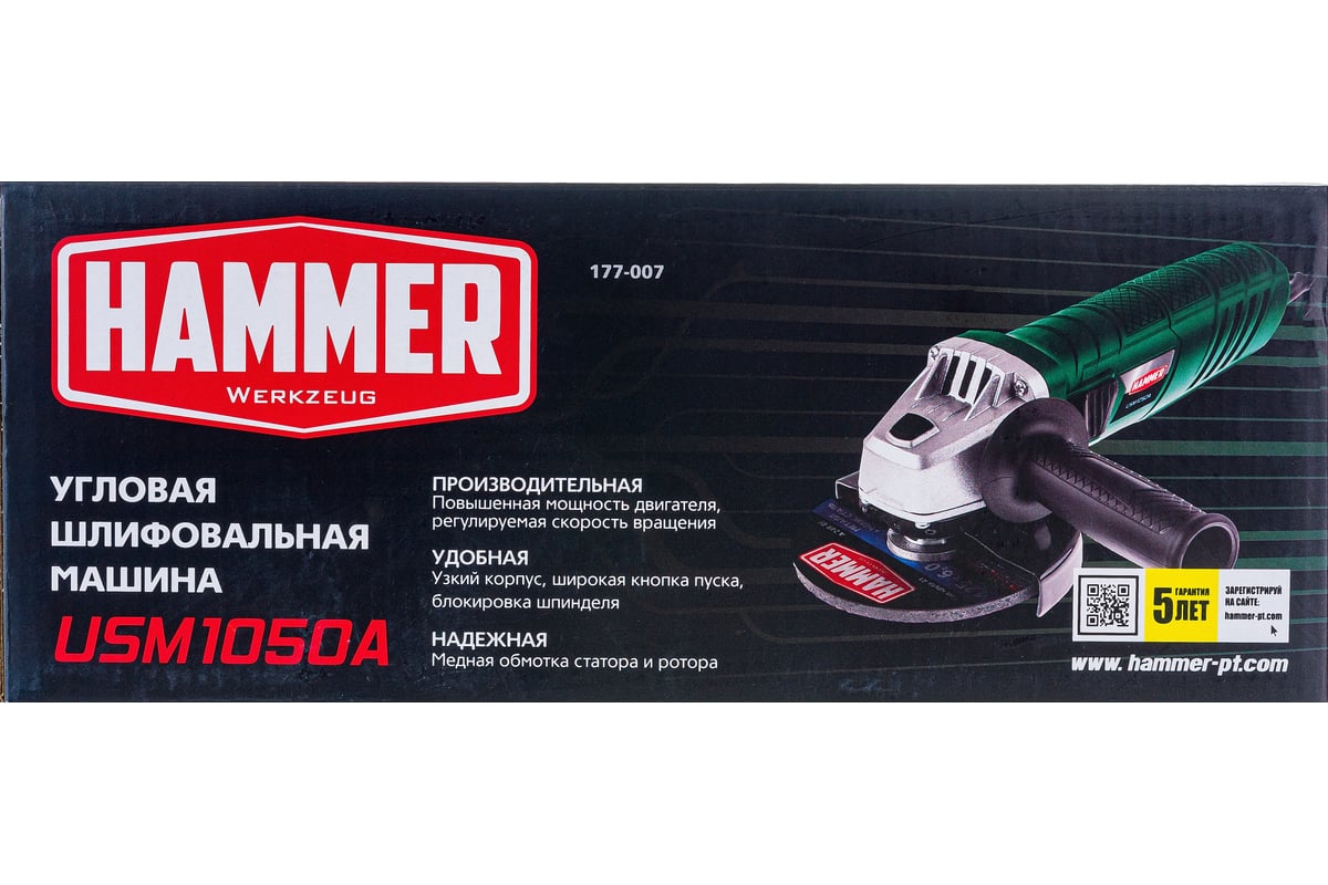 Угловая шлифмашина Hammer USM1050A 28444 обладает промежуточной мощностью в своем классе – 1050 Вт. Подойдет для использования в домашней мастерской: на даче, в гараже.