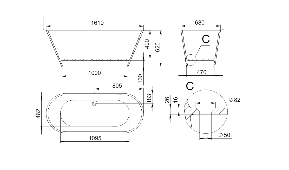 Ванна из искусственного камня Holbi Selena Nano Concrete 161x68 см бетон 2.01.006.44.4
