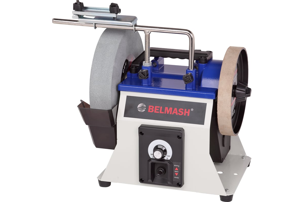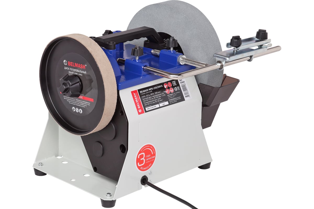 .Частота вращения заточного и полировального диска 90-160 об/мин. Вращение дисков осуществляется в обе стороны (реверс). На переднюю часть корпуса выведены трехпозиционный выключатель и ручка плавной регулировки оборотов. Для мокрого шлифования предусмотрена емкость для воды.