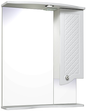 Зеркальный шкаф оборудован одним врезным светодиодным светильником 220В, розеткой с выключателем. Справа - шкафчик с распашной дверцей и одной внутренней полкой. Под зеркалом - нижняя полка. Петли со встроенным доводчиком, ручка-кнопка - 1 шт. Выпускается только в правом исполнении.