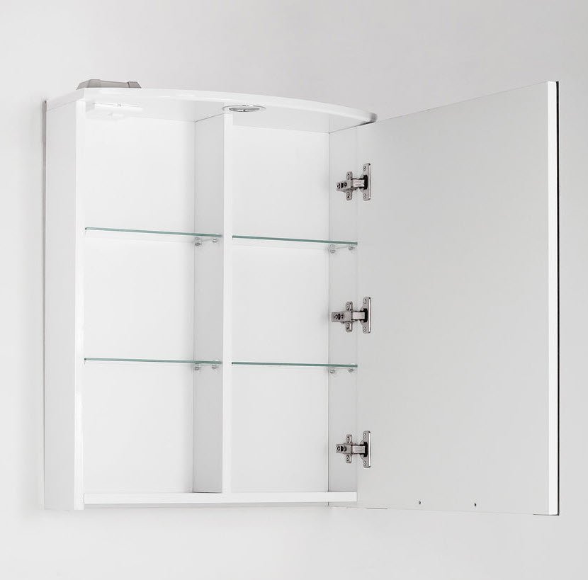 - Оснащение: зеркало с подсветкой (встроенный светильник с выключателем, трансформатор, розетка), механизм доводчика для плавного бесшумного закрывания дверцы