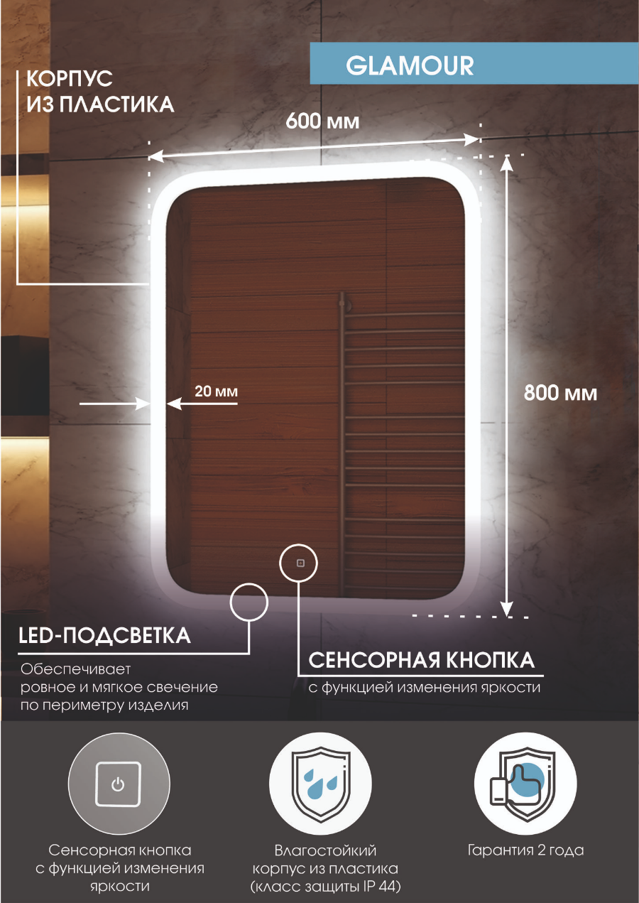 - Модель обладает современным дизайном и удобным сенсорным управлением яркостью подсветки, расположенным в нижней части зеркала