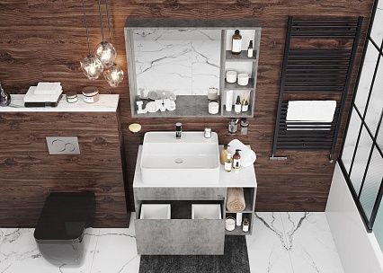 Зеркальный шкаф Onika НЕЙТ 90.12 отражает современные тенденции в дизайне мебели для ванных комнат: минимализм с простыми и понятными формами, эффектный цвет бетона, отсутствие лишних деталей.